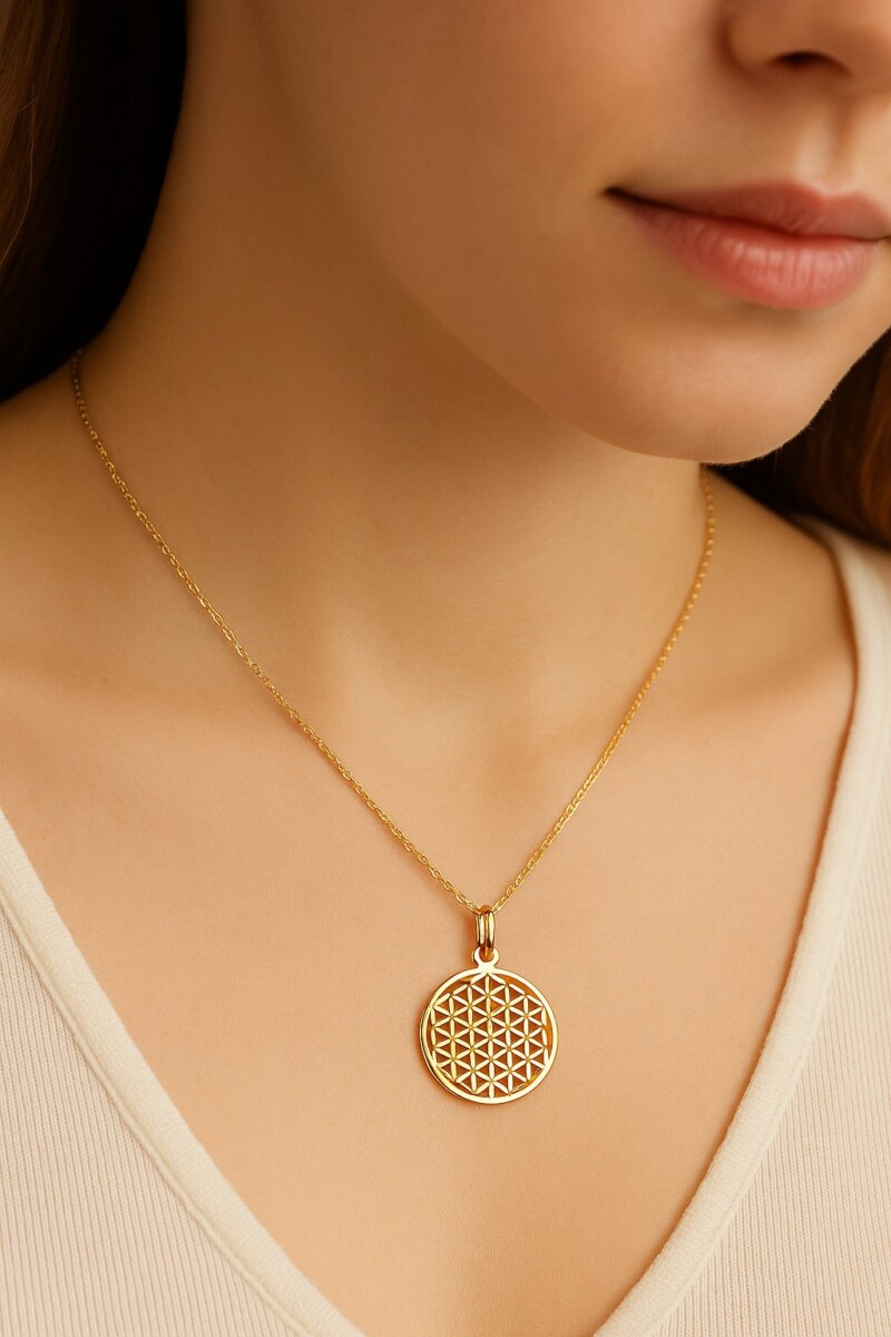 Złoty naszyjnik KWIAT ŻYCIA to misterna, ażurowa biżuteria w której zakocha się każda kobieta! Polecamy ją zwłaszcza tym, którzy potrzebują symbolicznego wsparcia w nowej pracy, związku czy przy zmianie miejsca zamieszkania. Zaczynasz nowe? Będzie Ci asystować w codziennym życiu.  KWIAT ŻYCIA doda Ci determinacji i odwagi w osiąganiu celów. Noś ten pełen uroku naszyjnik także jako symbol ochrony cennego zdrowia.